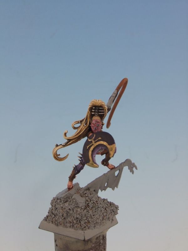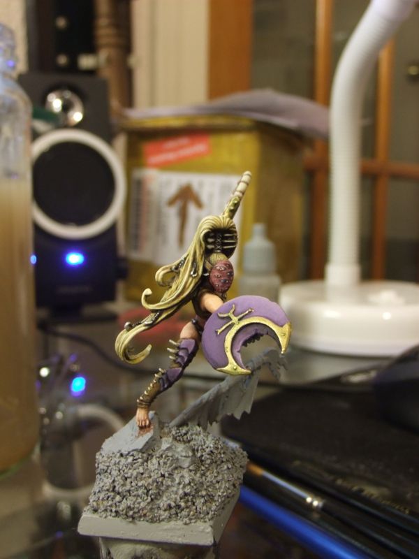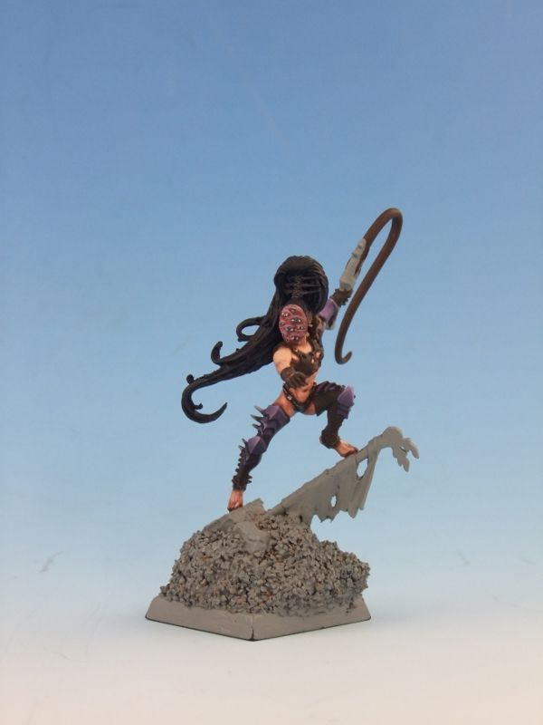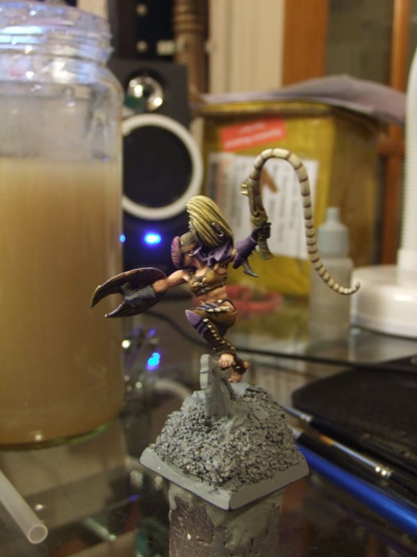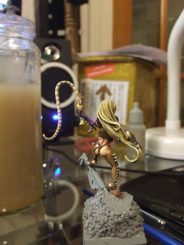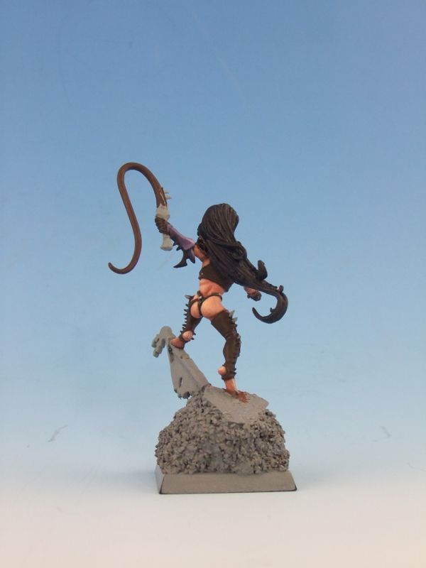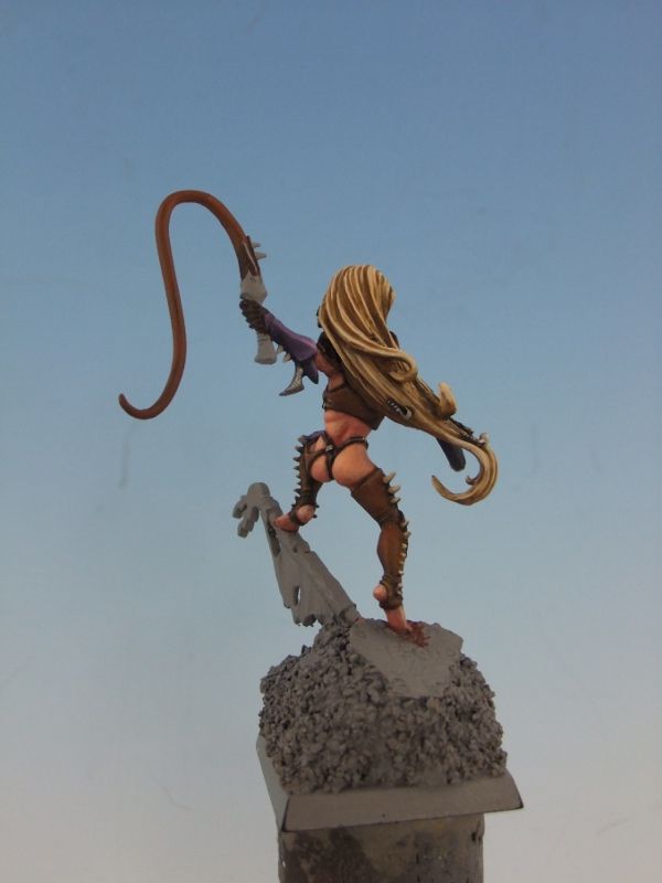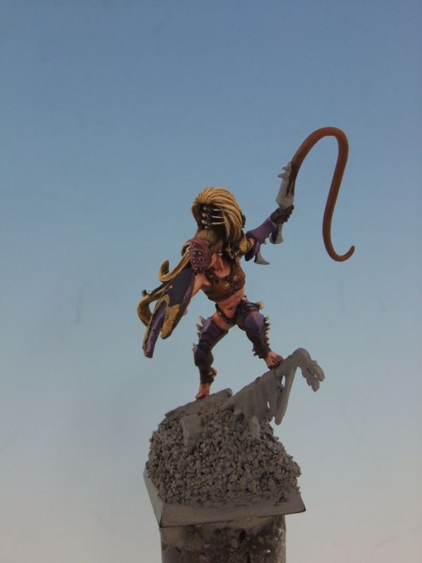 She is very much WIP.  She will have a shield in the forward arm and I think I am going to paint the hair blonde instead of the rich purple. Also the whip I think I am going to paint creamy and segmented like a rattlesnake's "rattler".
