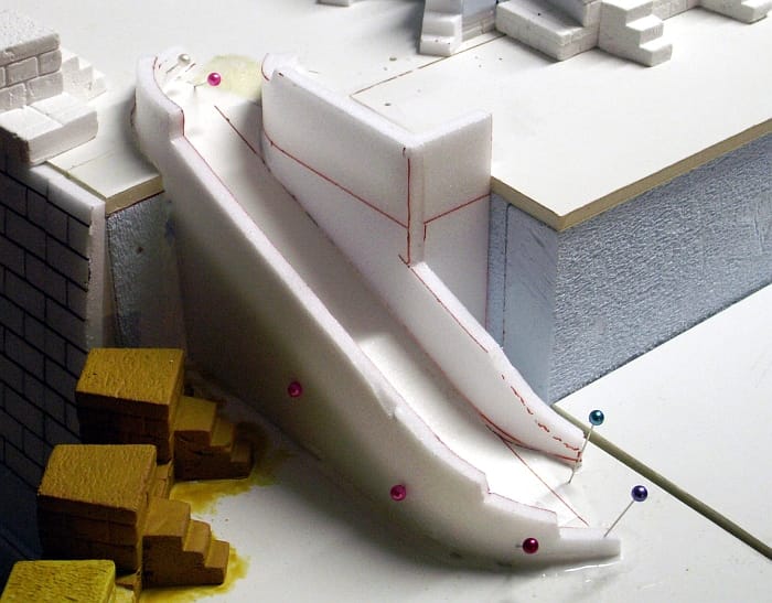 Started the curved ramp to the upper level bastions. The choosen material was Selitron as it can be curved by kneading and pressing it slowly and carefully with fingers. the callenge was to get the gradient and curving correct in one go ...