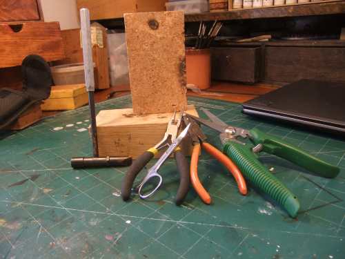 Needle nose pliers, scissors, cutters, a watchmakers hammer. Wooden blocks. Pliers are needed to bend the material and to hold it, because it gets hot, hot, hot. Thin brass sheet can be cut with nail scissors, which is preferable, since the cutters tend to warp the sheet metal in ways which is less than desirable. A small hammer like this is a bit of a speciality tool but I find it hard to do without since it gives you better precision. The heads on this one are screw on and comes in different shapes and materials. The wooden blocks are of oak and cork, materials which doesn't burst into flame as easily as other types of wood.