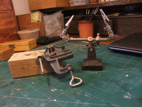 A vice and 'second hands'. Both are vital. I have a larger vice to but this small watchmakers vice I inherited from grandpa Hammers. It has a little anvil thingy on it. You could of course use any lump of reasonably flat iron but the vice/anvil combination is very handy. The second hand thing is familiar to most people who work with soldering irons. If you don't have one you'll soon find you need one when you do this kind of work.