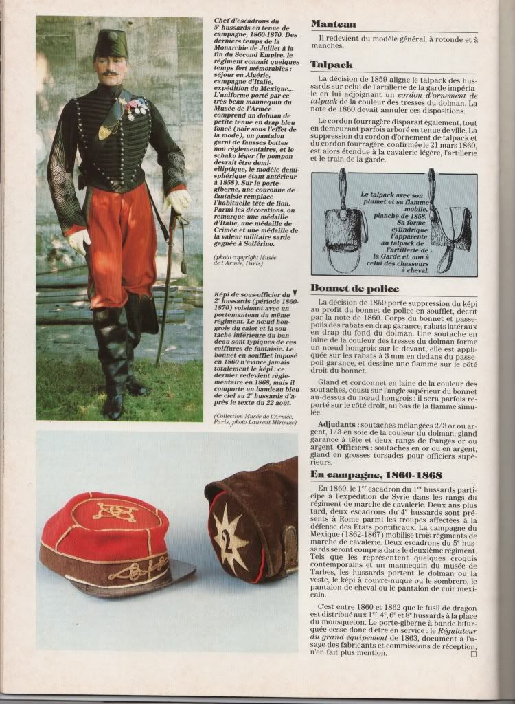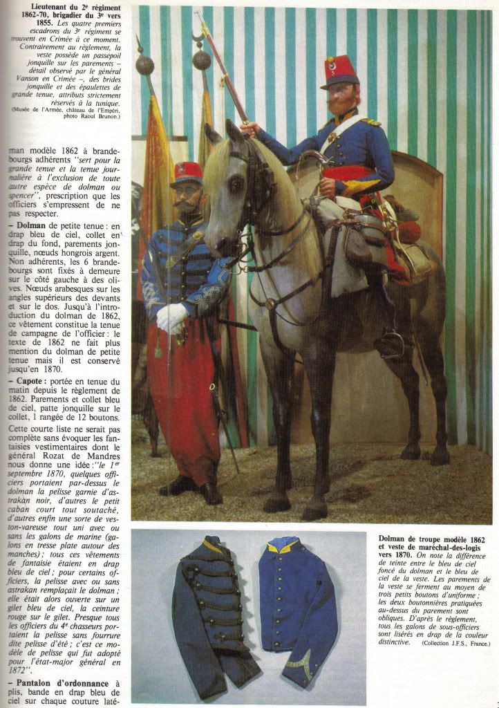 The pics below show a trooper in campaign dress as sketched by Benigni, a photograph of an officer circa 1863, another one of a lieutenant Teurkhauff in 1859 after his return from the Italian campaign and a scan from issue 22 of Tradition showing the Musée de l'Armée mannequin of an officer in regulation campaign dress.