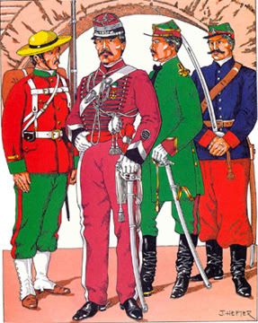 The men were supposed to take the field wearing their dark blue dolmans and red trousers with fake leather booting, but the much plainer veste (shell jacket) seems to have been a very popular garment. The pelisse was never used in Mexico, even in cold weather, so may be omitted altogether. The shako wasn't used in the field, being replaced with the kepi which was usually worn with a white cover and havelock. Both period photos and illustrations show that the sombrero was extensively worn instead of the kepi. The African army's cloth waist sash also appears to have been quite popular, and the practice of wearing it probably originated during the 5th's stint in Algeria in the late 1850's.