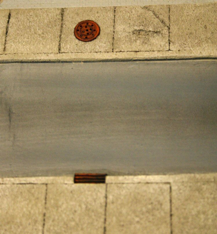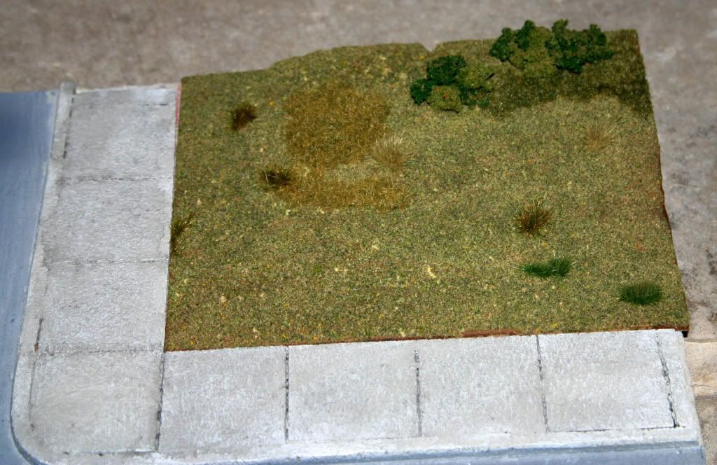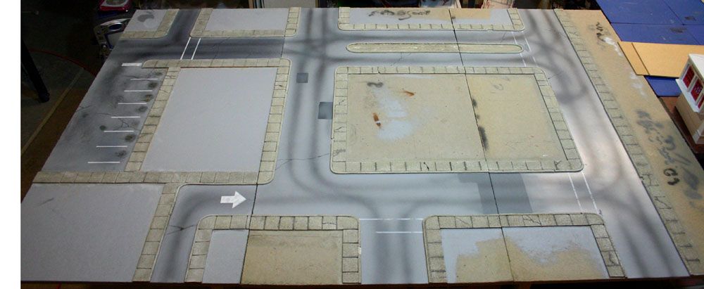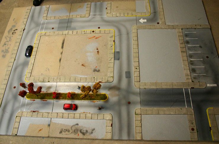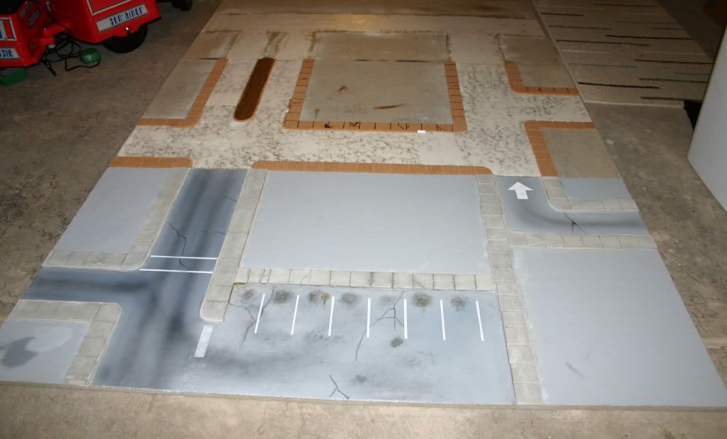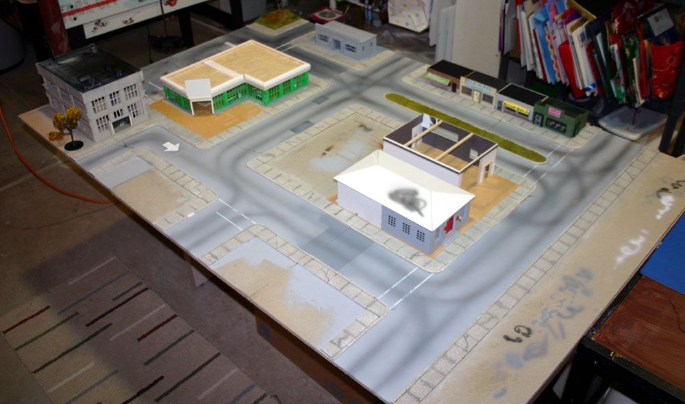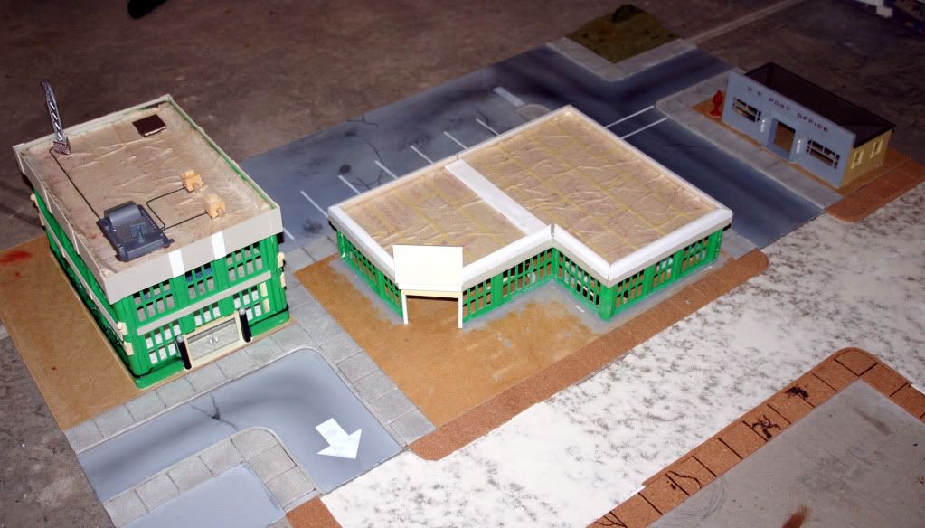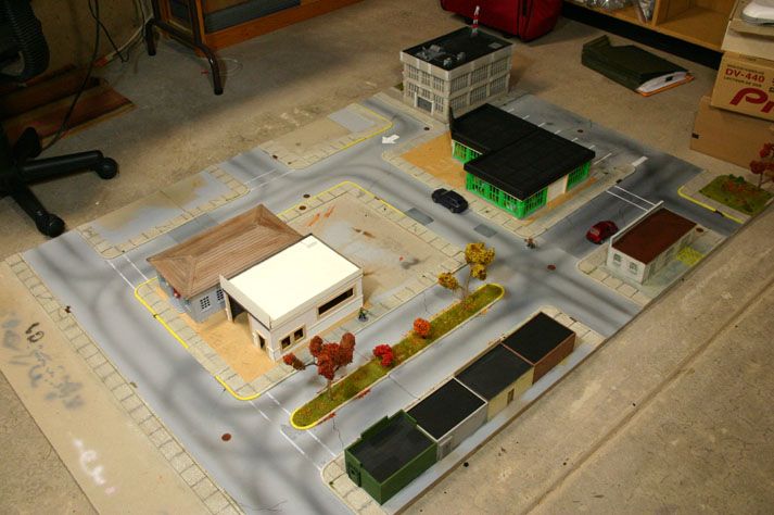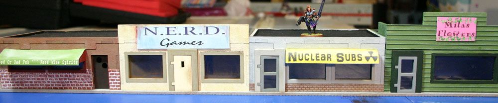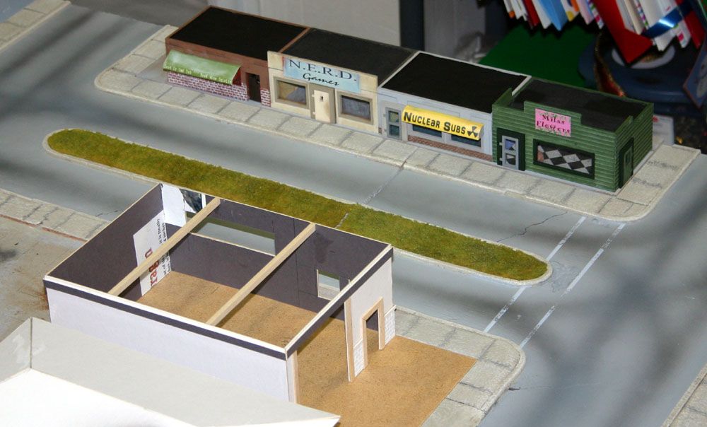 The back of the mall. I haven't done much decorating here, as this sits right on the board edge. That strip on the ground is wide enough for a model, but that's about it.
