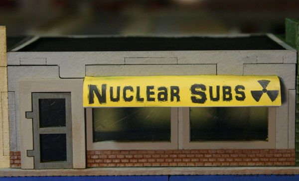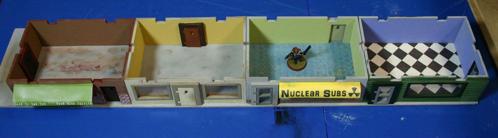I arranged the buildings in a strip mall style, but varied the fronts. This is typical of towns in the Midwest that have older buildings re purposed into stores. The owners of each unit are free to make their store look how they want. I also did this to show that with a little work, you can make these boxy buildings really unique. I used acetate for windows and door glass.