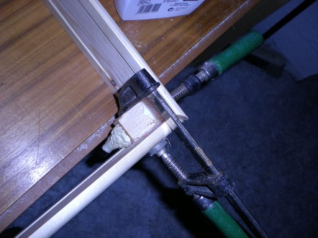 The construction of the frame took a while longer as it  measures 1m10 x 1m10. Reinforcing beams had to be added to prevent warping of the frame. Here is how the corners have been fixed after gluing with white glue: