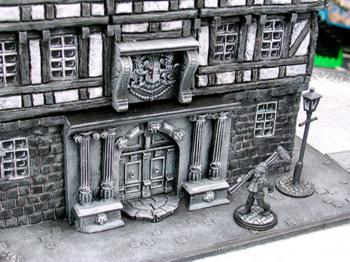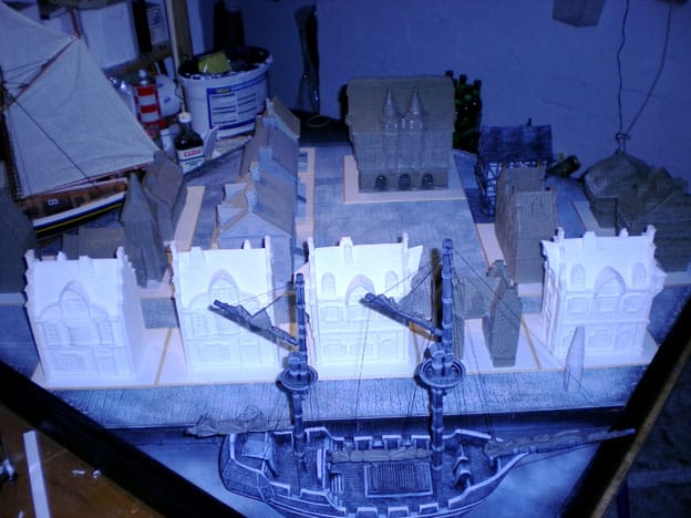Final layout with finished pavement and ship added. The boardwalks are made of foamboard that i framed with wooden rods. The paving stones are cardboard cutouts.