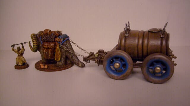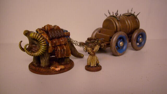 And one more Bantha - this one used the Micromachine version, but I cut all of the hair off and added lots of little bits, and then built a wagon.  I am not over happy with the wagon, but I built it only out of stuff I already had, so I can't complain much.