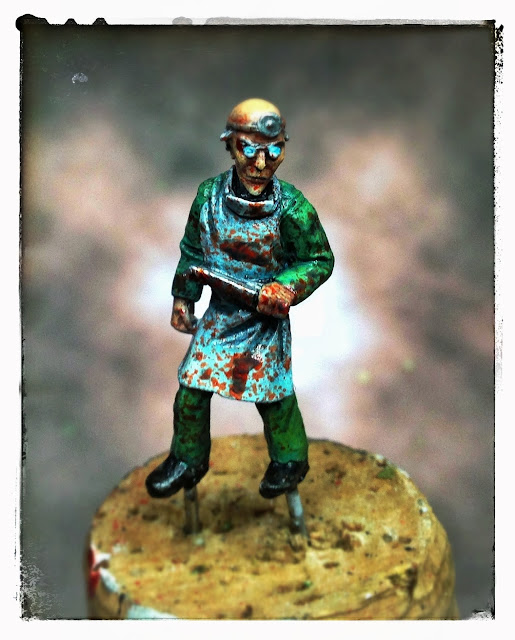 Next one of the mad doctors from RAFM Call of Cthulhu miniatures. It have been sit on my painting desk for aeons mostly because I wasn´t sure what colors should I use for his clothes. I decided yesterday to go for a traditional scrub of nowadays surgeons so it still can be played on my modern zombie apocalypse games.