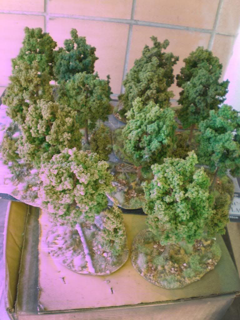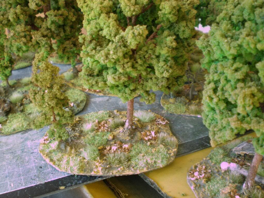 The bases are undercoated with a mash of water, sand, white glue, green and brown paints and plaster and then drybrushed light yellow.