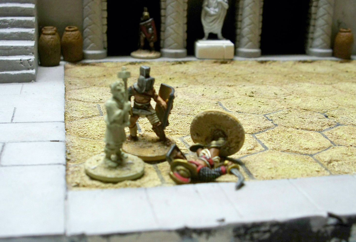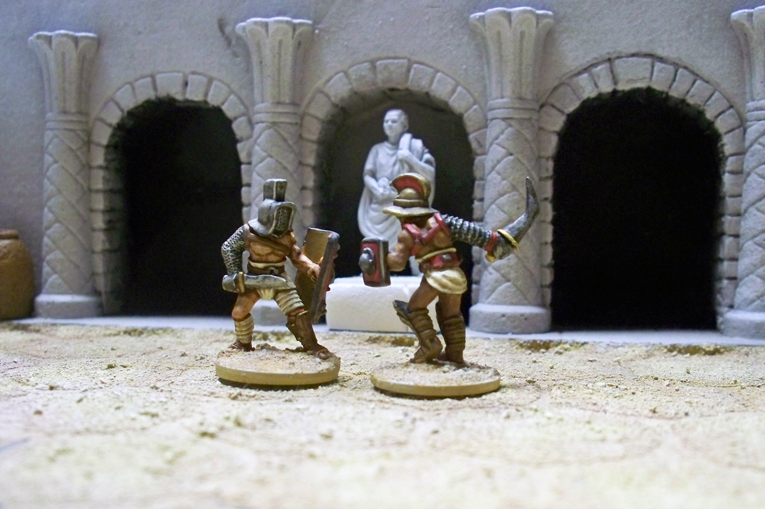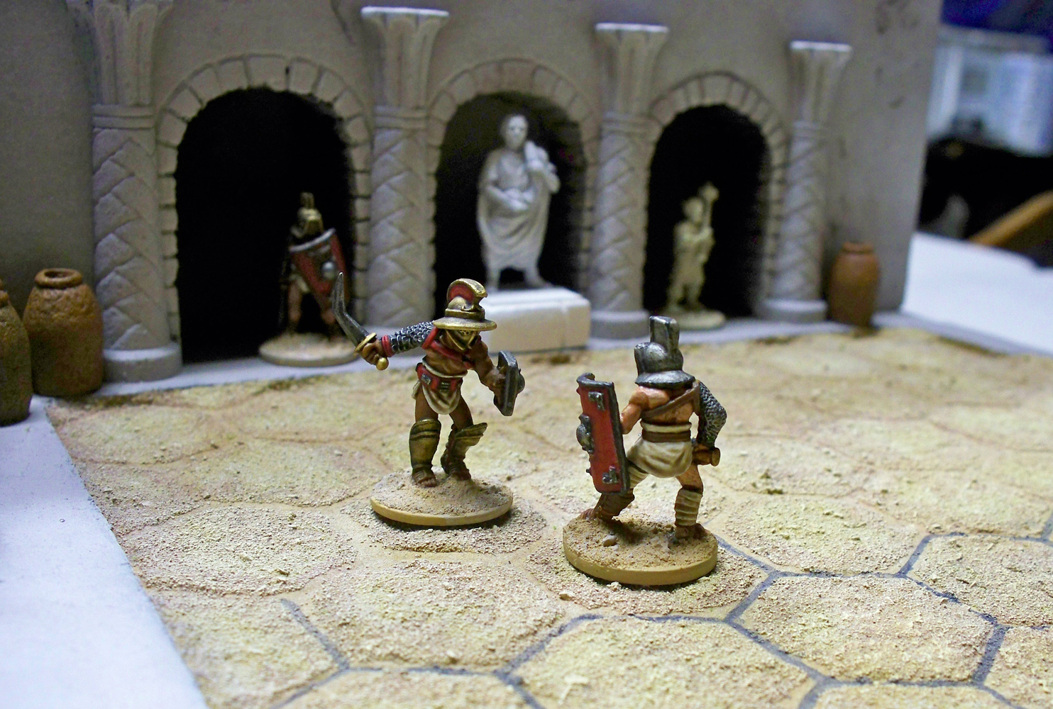 In a villa outside of Rome the peers of a wealthy patrician have gathered to witness a private gladiator pairing between Drusix, murmillo, and Lyphades, thraex. The gladiators have been chosen carefully and are considered well matched.