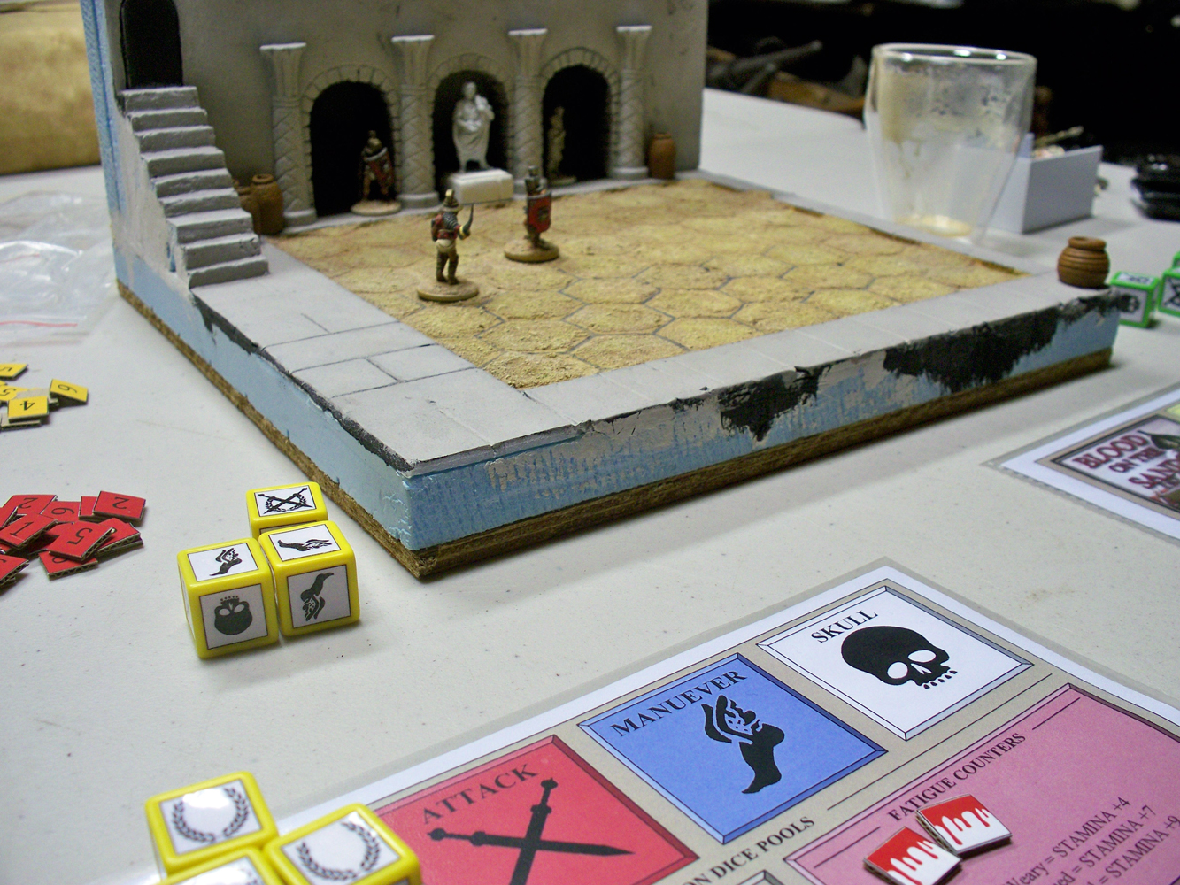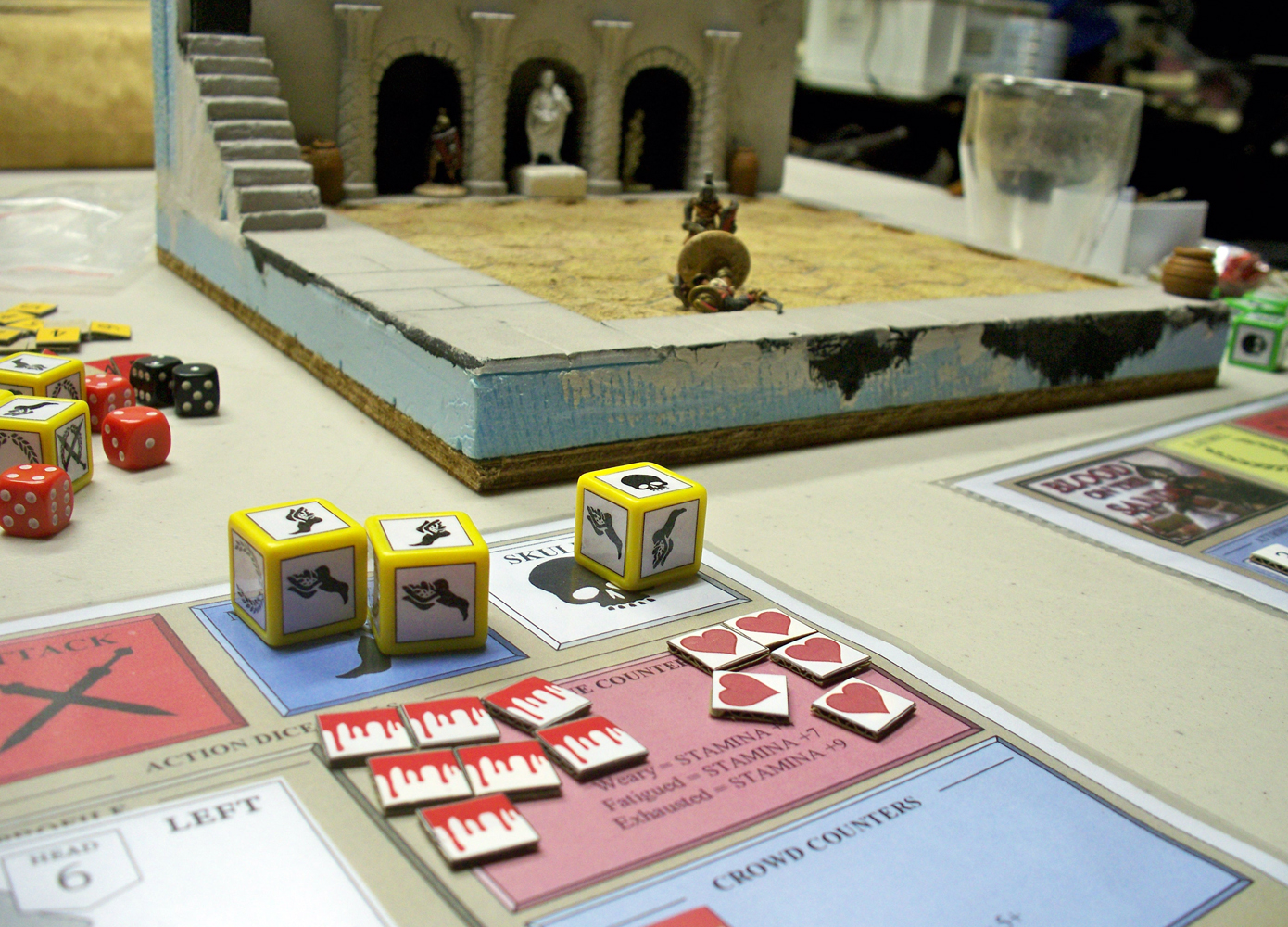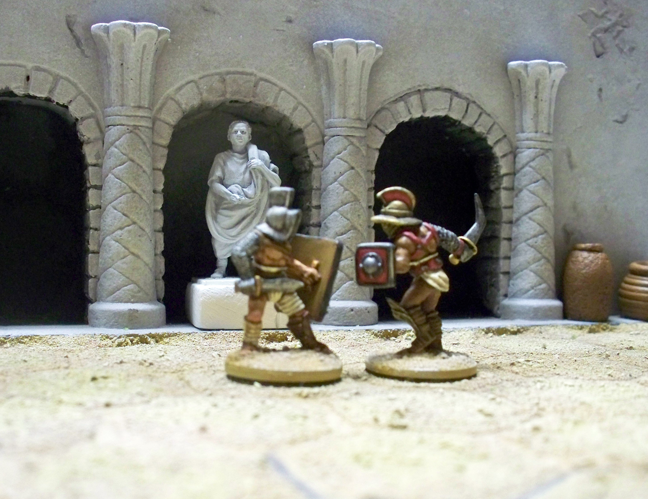 In a villa outside of Rome the peers of a wealthy patrician have gathered to witness a private gladiator pairing between Drusix, murmillo, and Lyphades, thraex. The gladiators have been chosen carefully and are considered well matched.