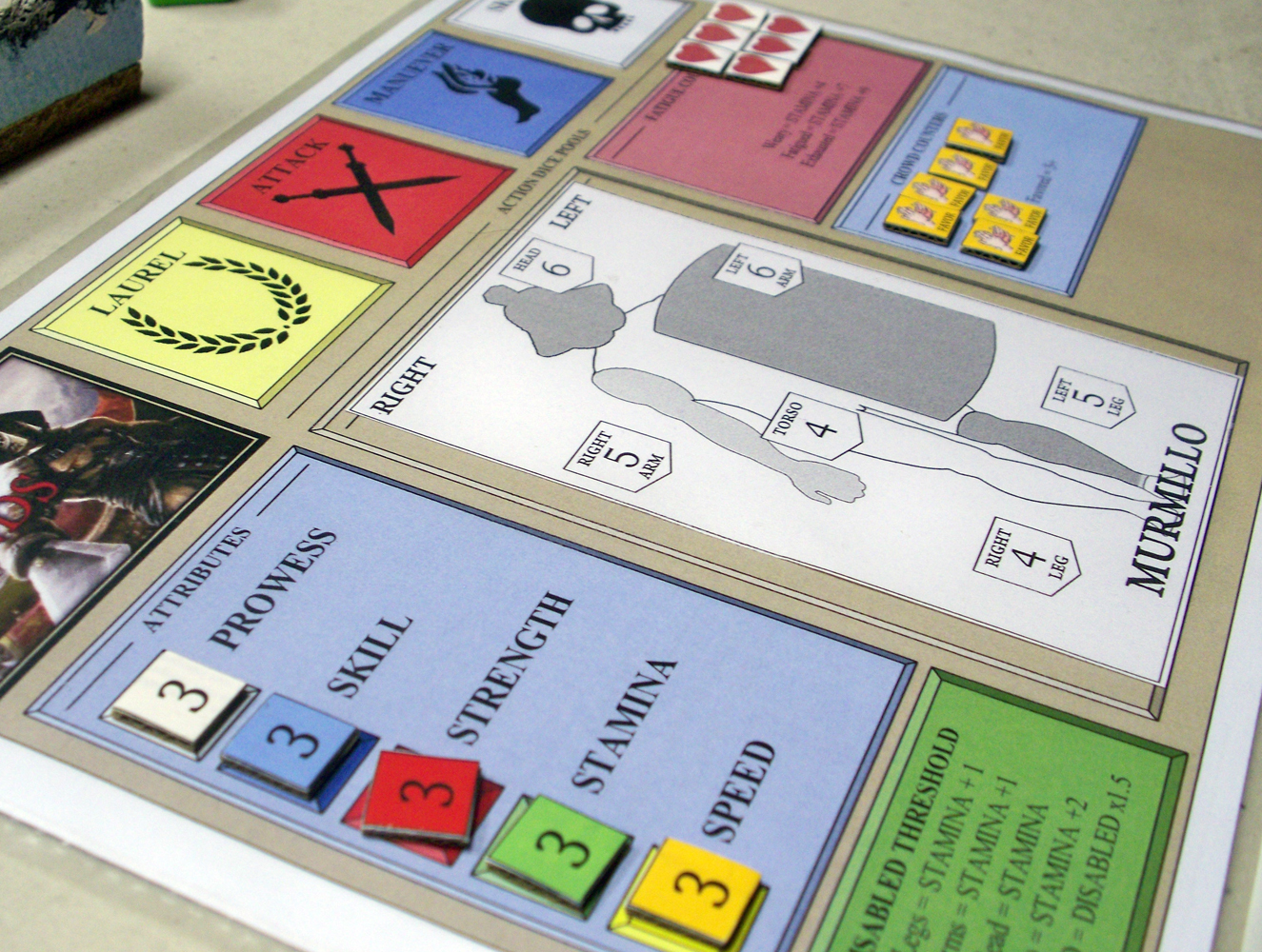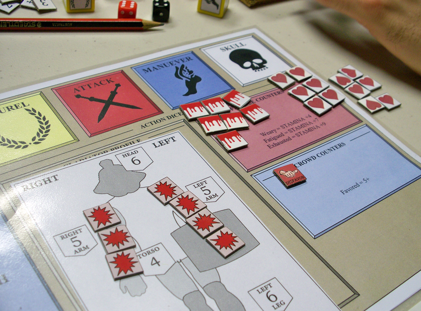 Panting heavily Lyphades closes on the murmillo again, but his attacks fail to circumvent the large shield. The flurry leaves the thraex spent and Drusix stops giving ground, launching his own attacks. Each blow is a simple basic strike that drives the thraex back again, each blow becoming more dangerous than the last. The murmillo's last attack is well aimed and backed with considerable force. It lands just as Lyphades' foot touches the lip of the enclosed arena. Drusix's blade drives deeply through the shoulder of the thraex's shield arm, a bright spout of blood washes over the sand.