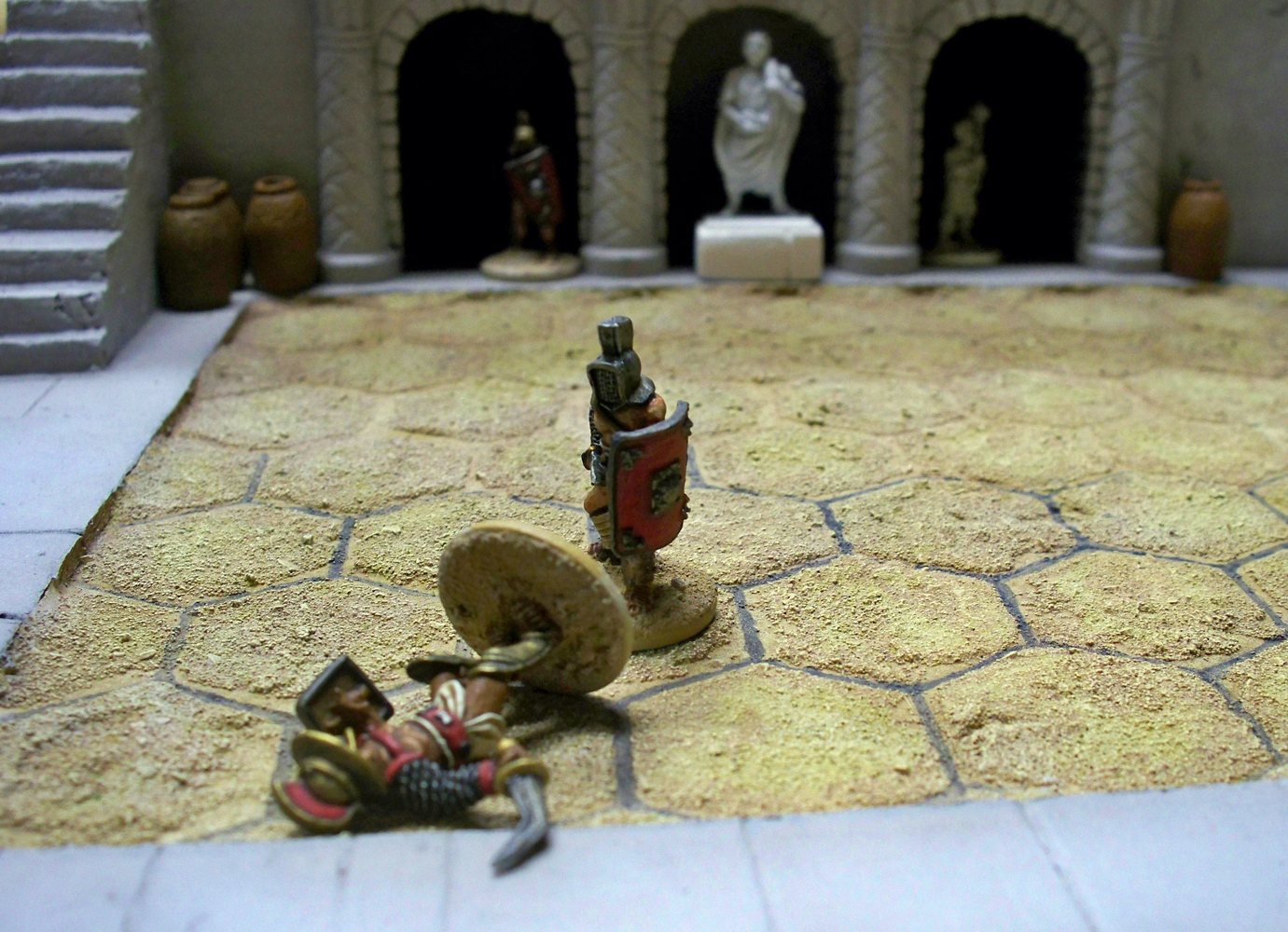 Drusix knows the match is won, the Romans are calling for blood and he turns to them drops his shield and raises his bloodied gladius. Turning back to Lyphades he sees the thraex can not stand and so his opponent feebly raises two fingers in surrender, begging for missio. But it is too late for such thoughts. Drusix fought too well and avoided all of the thraex's attack. The crowd howls for blood and the patrician gives the word. Drusix raises the gladius again and drives it down through Lyphades' shoulder-blade. Victory is Drusix's!!