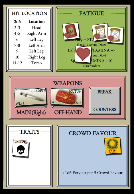 Titus must immediately determine if the wound is bleeding heavily enough to hamper him. He makes a Stamina (3) test against the amount of wounds (2) taken, and rolling his 3d6 scores a 3, 3 and 5. He only manages 1 success, when he needed 2, so unfortunately for the thraex, the wound is bleeding, but not as badly as it could be. Titus adds a single bleeding counter to his fatigue box, along with a favour counter to his crowd favour box. The crowd likes to see their gladiators bleed.