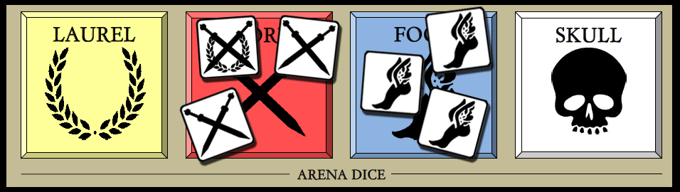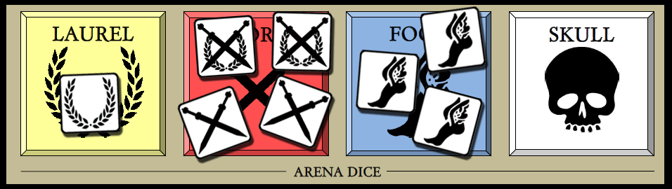 TURN IMarcus and Titus are placed in the arena, separated by 5 hex spaces. Each of the players take a number of Arena Dice equal to double their gladiator’s Prowess scores and roll them. Marcus will be rolling 8 Arena Dice and Titus will be rolling 6. These rolls will determine the number and type of actions that will be available to each gladiator this turn.