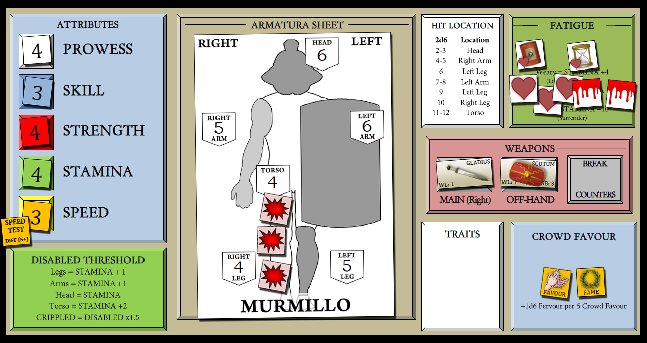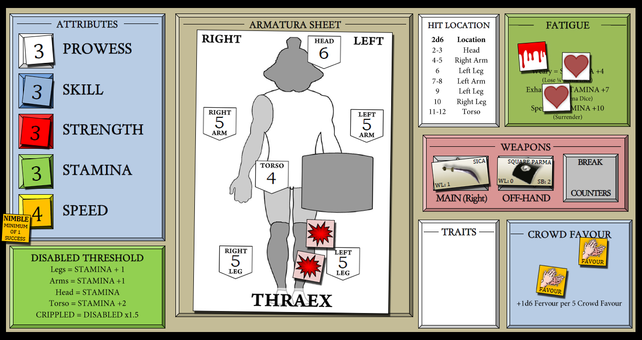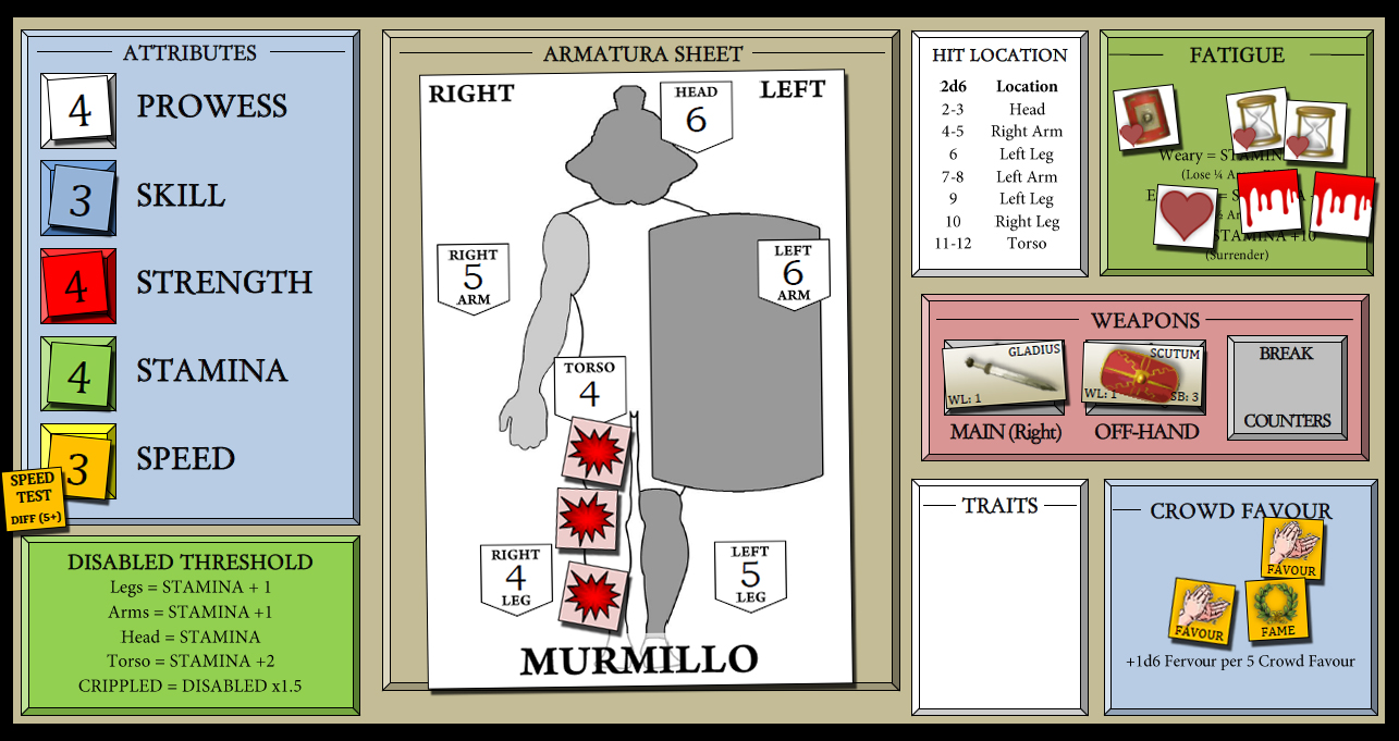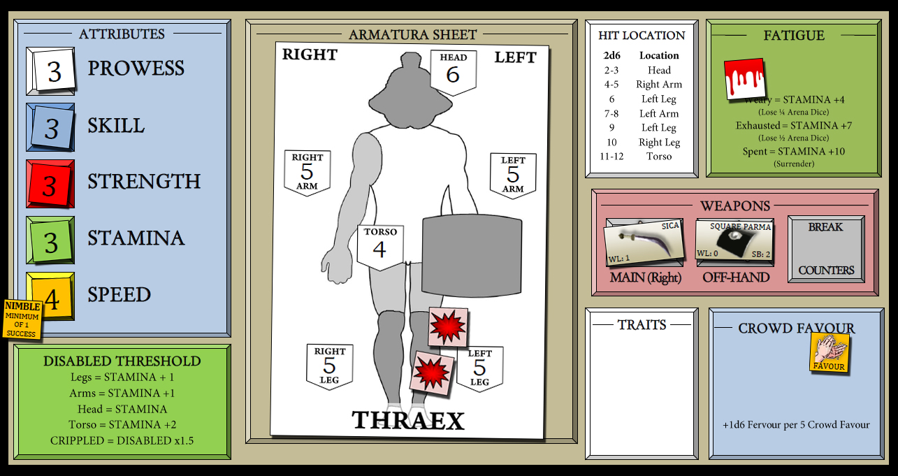 Rolling 2d6 on the Hit Location table he scores a 6, resulting in a blow to Titus’ left leg. A quick look on the thraex’s armatura sheet shows that his left leg is armoured and will require rolls of 5 or more to damage him there. Marcus now determines if he has wounded his opponent, by adding his Strength (4) and the number of successes (1) he achieved in the attack and rolling the 5d6. He scores a 1, 1, 4, 6 and 6, resulting in 2 successes. The thraex has been wounded and Titus must place 2 wound counters onto the left leg area of his armatura sheet. He is capable of taking only 1 more wound to his left leg before suffering any detrimental effects. The crowd roars as Marcus adds a favour counter to his crowd favour box for wounding his opponent.