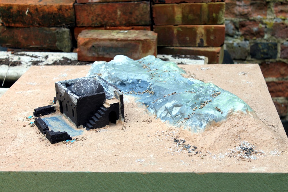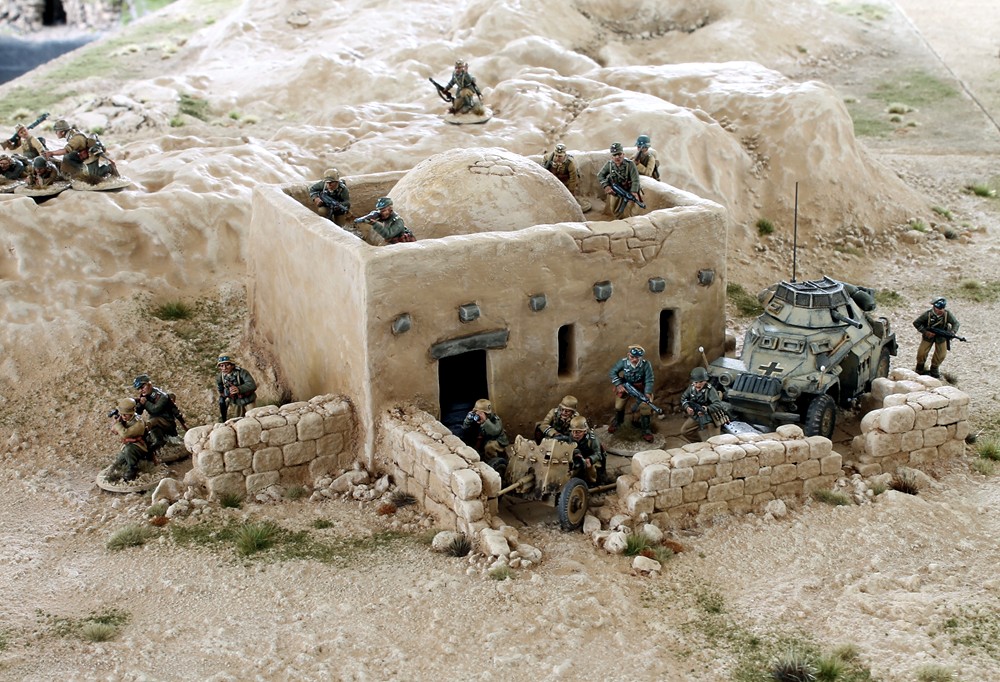I decided to use another offcut piece of 1:1 scale theatrical/TV scenery ABS plastic rock face to form a rocky ridge - with the Renedra mud brick house (plastic kit) backed up against this rocky outcrop.