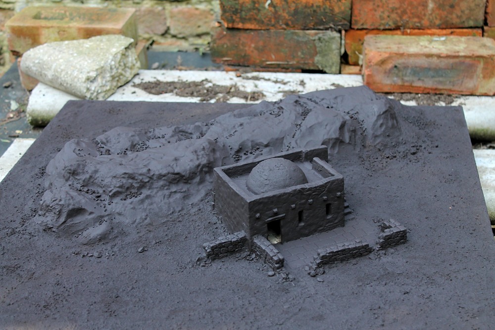 Then a slathering of lightweight wall filler to conceal all the joins between the rocky ridge, the foam slab and the house. I also used this to build up the groundwork behind the house, and to create pathways for infantry up onto the rocky outcrop.