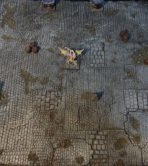 Turn 5- Jabberwick, blundering around at random again mistakes the cultists for the Prince of Orange Squash´s men, and starts to follow them.  Fortunately, flamehead is alive to the danger and swoops in to blast them with a fireball.