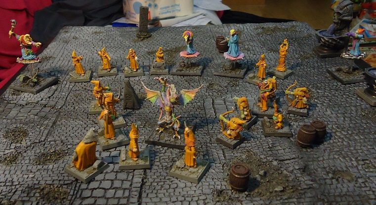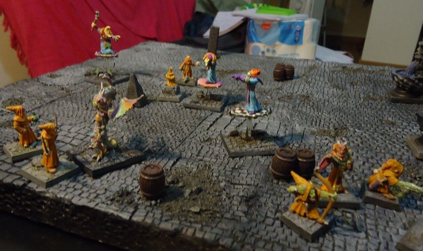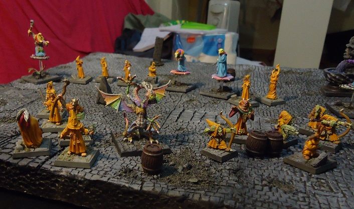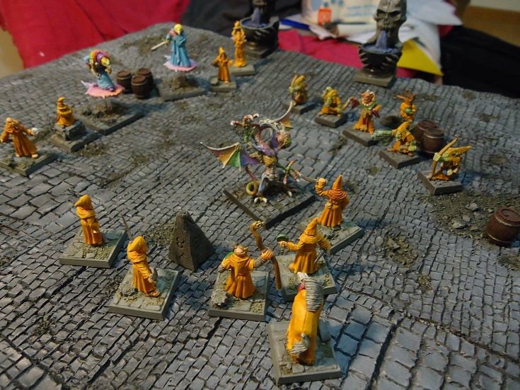 Bezrond, in disguise, deploys with a unit of cultists (on the left). The rest of the cultists come in from the opposite side. Fezrond deploys with the chaos goblins. Pre- battle casting: Bezrond - Assume illusory appearance (disguised as a Champion of Tzeentch); Fezrond - Create illusory hero (another champion of Tzeentch).