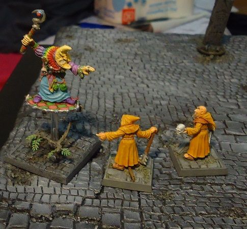 They announce their arrival in style. Moonface uses his magic ring to cast the lvl 3 spell cause cowardly flight on the cultists threatening to usher Jabberwick away. They flee. The goblins (along with Fezrond and his familiar) panic and flee too. In a further unexpected developement, the Earl, believing the cultists to be friends, must make a panic test too. He promptly fails and starts running away!