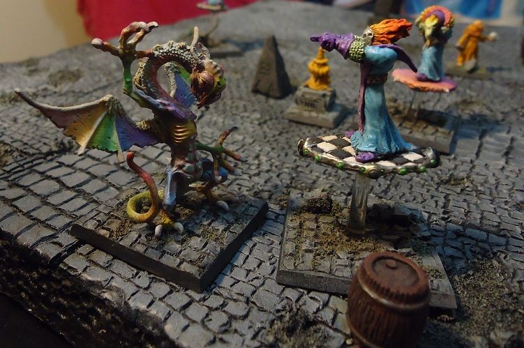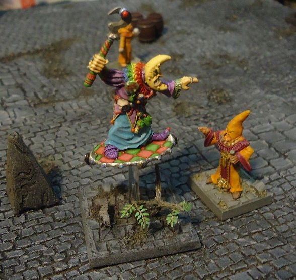 The Earl deploys in the middle of the courtyard. He is taking a stroll and will move d3" in a random direction unless other factors compel him to move differently. He is subject to nincompoopery and also subject to mistaken identity. Moonface, Champion of Tzeentch and his faithful companion Flamehead have heard that something is afoot and are rushing to the scene.
