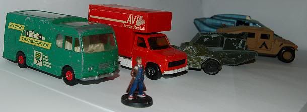 A slix fire engine, which is pretty small but doesn't look too out of scale because it hasn't got any visible doors. Also a couple of market day purchases yesterday- a really scratched up diecast sports car and a diecast sci-fi minibus that practically screams Judge Dredd, but sadly would only scale up well with 10mm figures. It'll make a cracking sci fi limousine, I imagine.