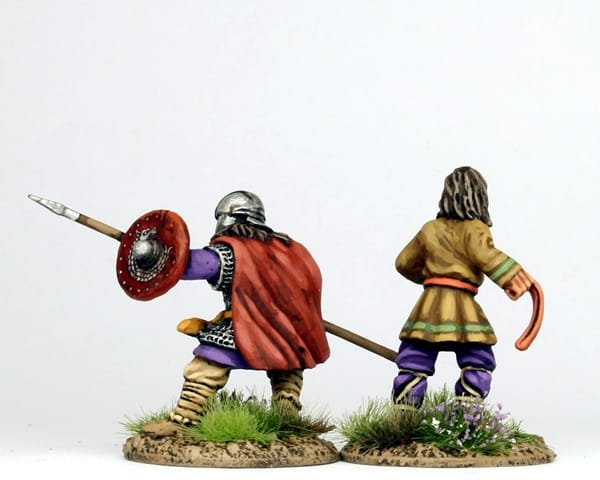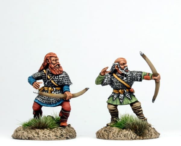 These are concocted from Gripping Beast plastic bodies and heads, Perry WOTR bow arms, and quite a bit of green stuff for added hairiness. I see these as old codgers who are past it for fighting in the shield wall, but who have hung onto the mail shirts of their glorious youth...