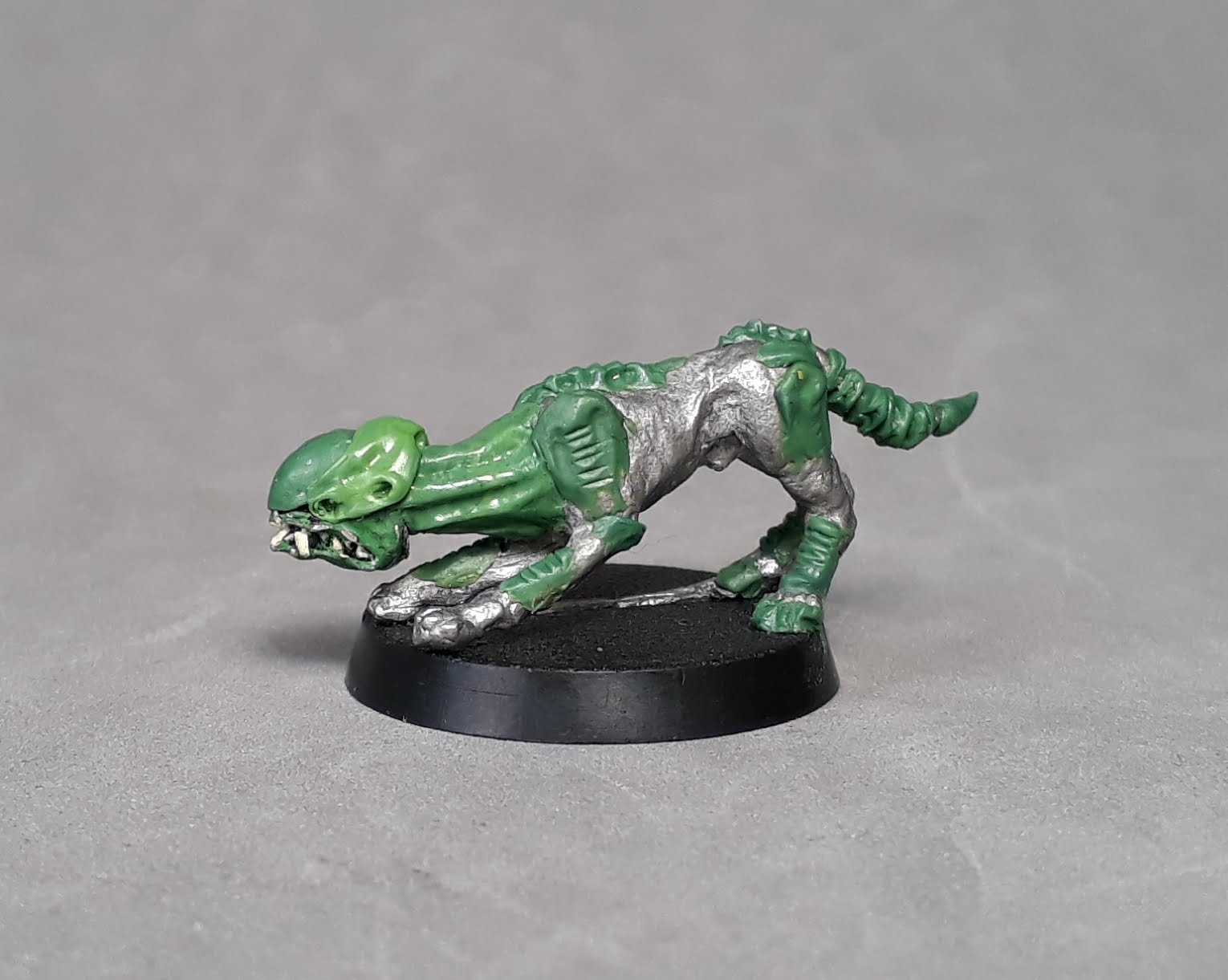I converted the hound from an old Citadel Blink Dog, with the addition of a lizard head and lots of greenstuff: