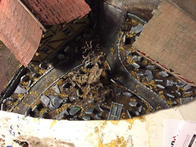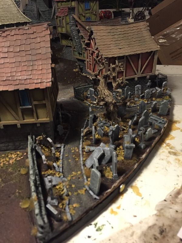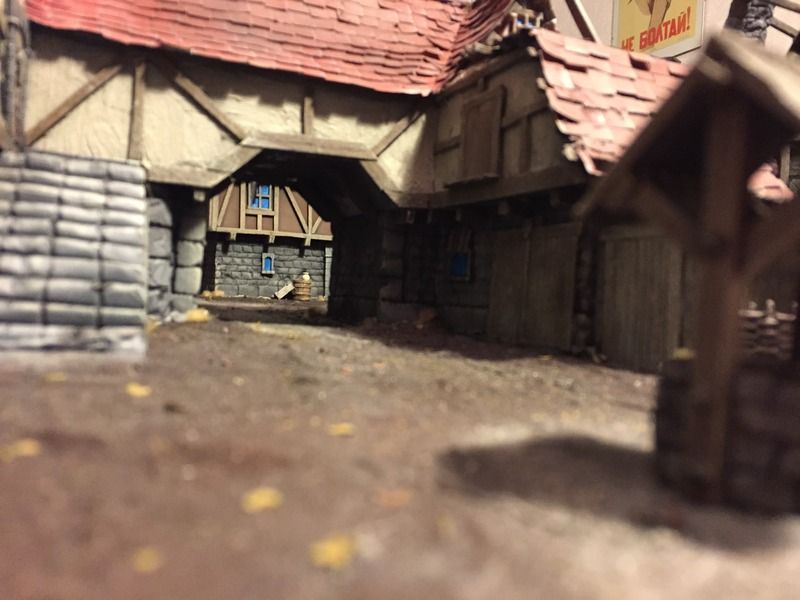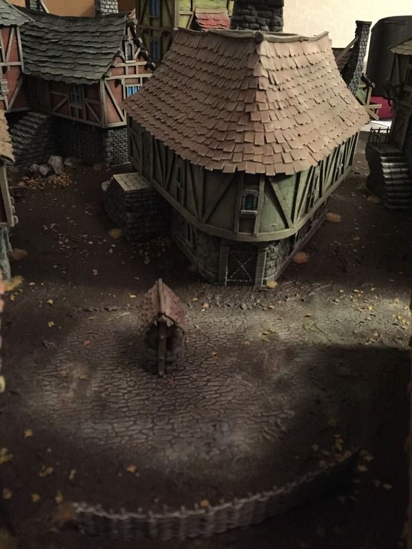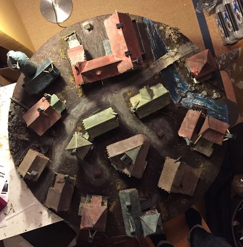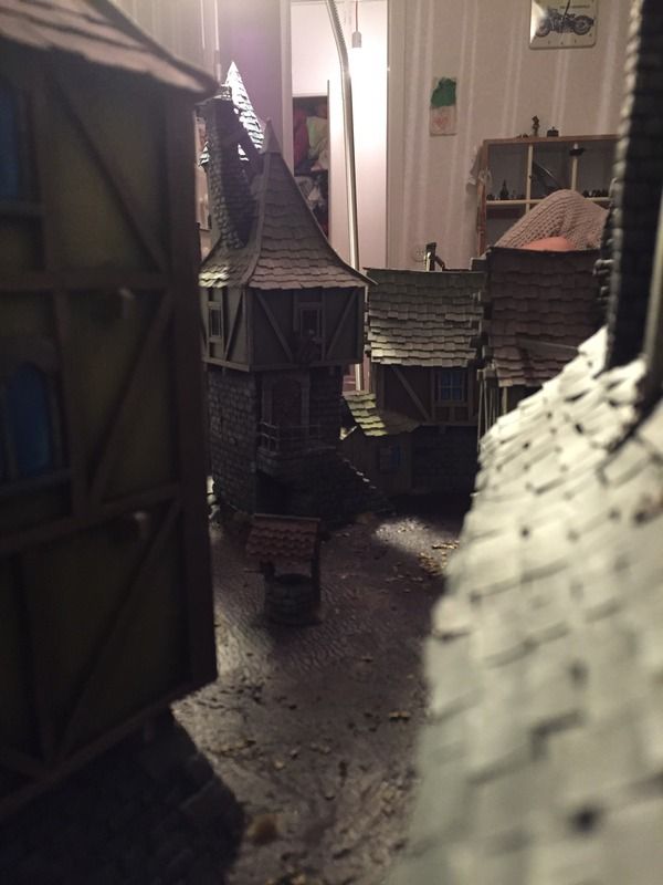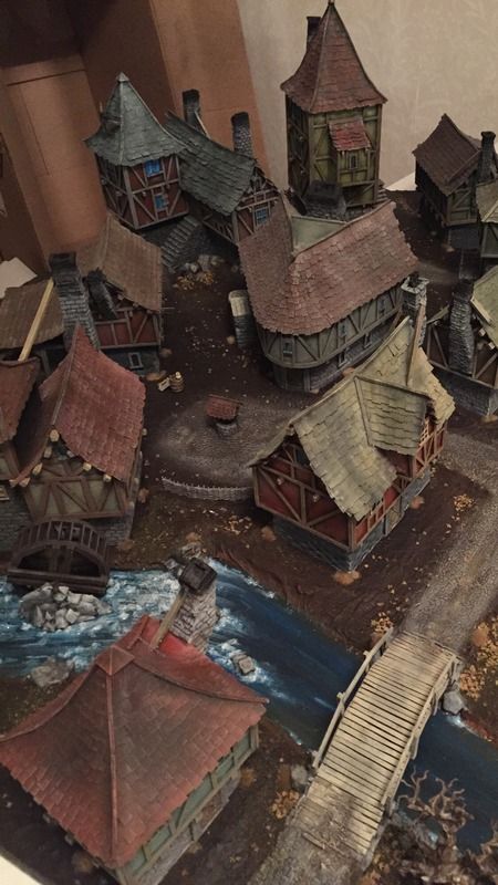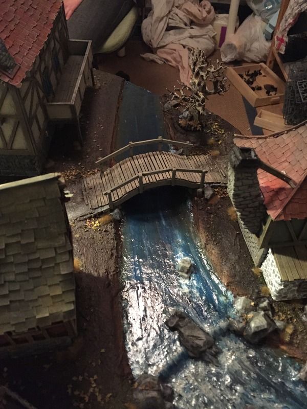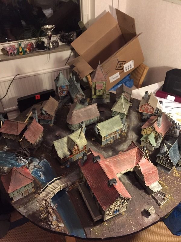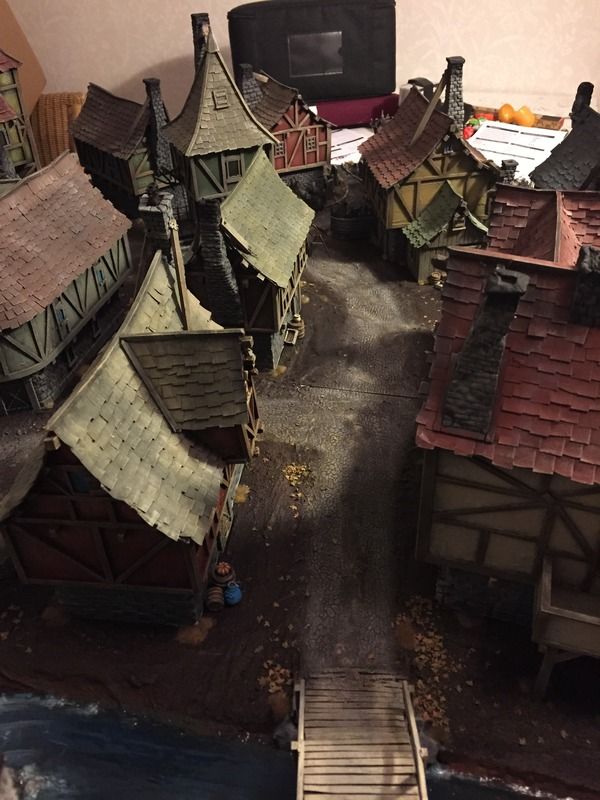 Everything is scratchbuilt except the fences, barrels, crates and urns. The lowest frloors of the buildings are carved "frigolit" as we say in Sweden. Foamed PVC, maybe? Blue isolation material, anyway. The upper storeys are cardboard, the chinmeys are friglit as well. The upper floors are covered with filler, and then I added frames of balsa. The roofs are strips of thin cardboard. The board itself is med of left over materials from work mostly: Hardboard base covered wit different layers of foma core sheets. Then fillerand a plaster like thing called husfix, used to fix small damages to housees in real life. Afte painting it al in a dark brown i covered it all with watered down glue and sprinkled a lot of leaves all over to get a feeling of cold, moisty fall. Sort of... The stream was a pain to make. I had plans of using some sort of clear resin, but couldn´t get my hands on it before I had to get it done. It´s simply panited with blue and white and covered wtih a couple of layers of glossy varnish and water effect. Works for me.