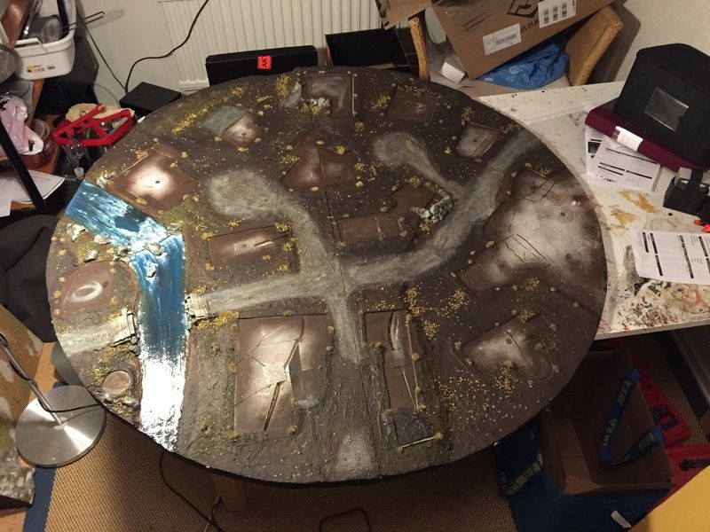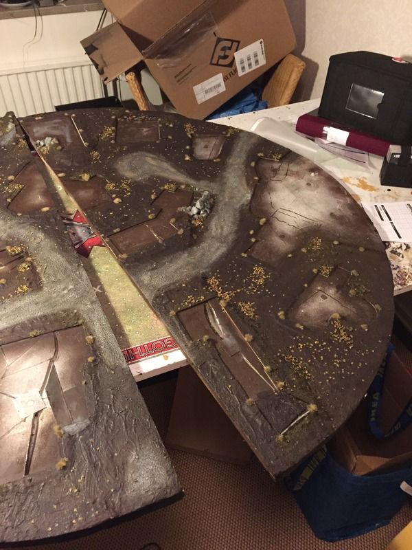 Without the buildings. The first one is with the two halfs drawn apart. It all fits together with strong magnets, so once it´s in the right place it stays there. The buildings have "footprints" where they fit exactly, also secured with magnets. What I lose in modularity (is that a word...?) i gain in appearance.