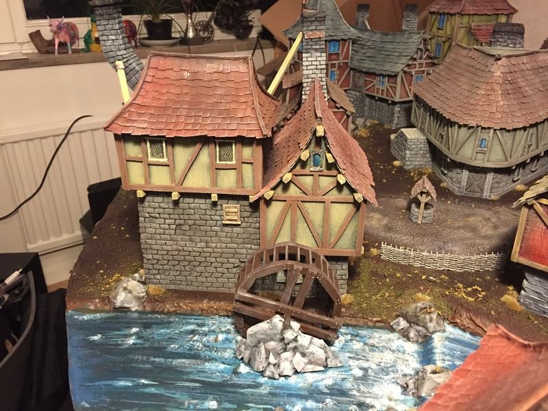 Mordheim was an initial idea, but I wanted the houses more non-destroyed. I want it to look like a town that is actually inhabited. As the buildings dont have an interior it is also rather "flat" in the sence of where you can play. Mordheim needs different heights to work, I think. We talked about adding a lot of ladders, ropebridges, and planks to make walkways on top of the buildings, but I don´t think it will fit.