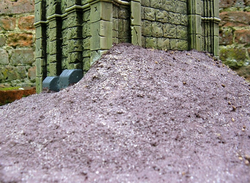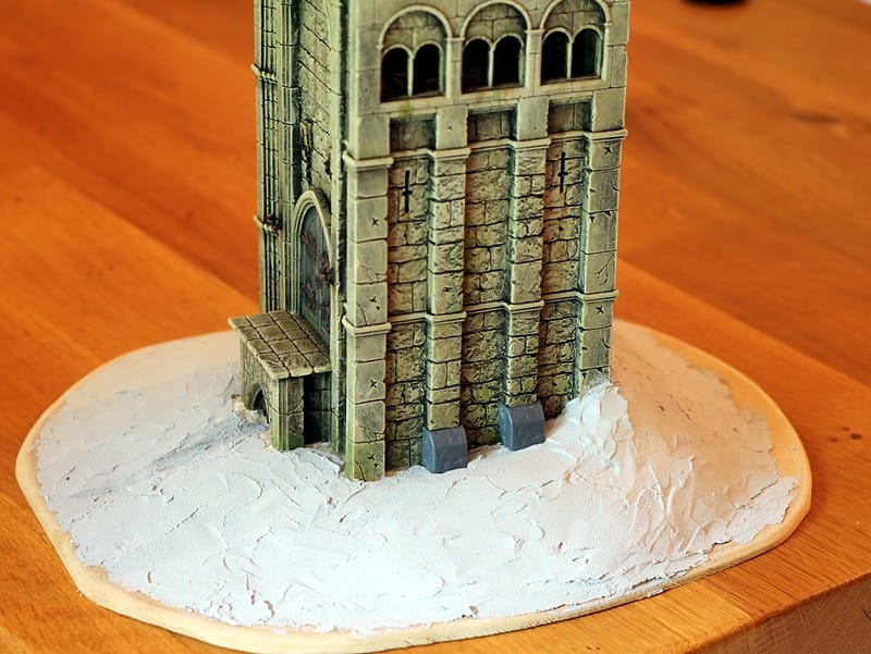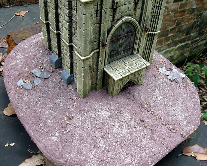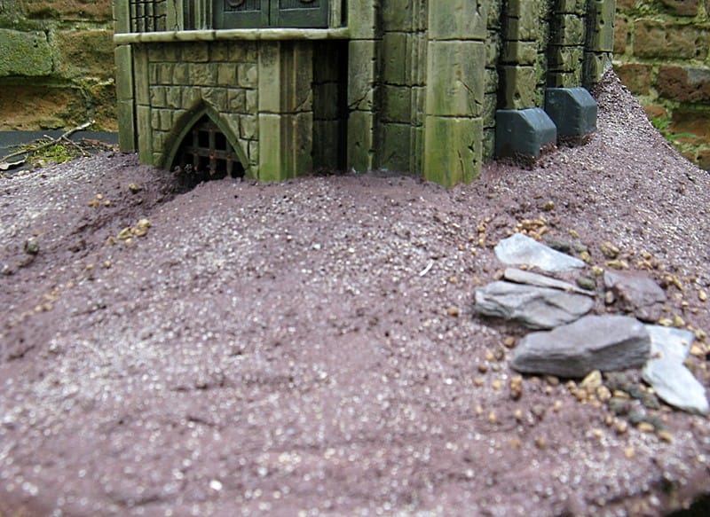 Meanwhile, I've built up the underlying ground contours using aereated fwall filler - this is basically just like icing a cake, although the surface doesn't need to be perfect because the final ground surface will be provided by a mix of PVA/sand/grit/paint. Small rocks etc will be added at that point too. I was going to build some big rocks in at this stage, but decided that rather than sitting on a crag (which would have required a much bigger base footprint) I just mount the tower on a nice grassy knoll :)