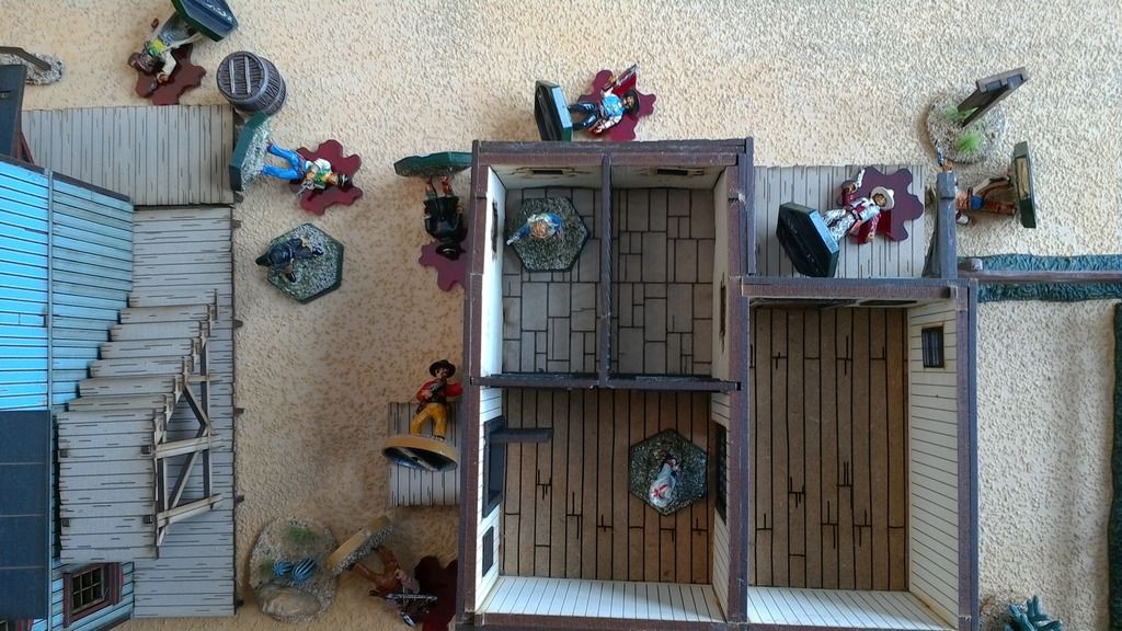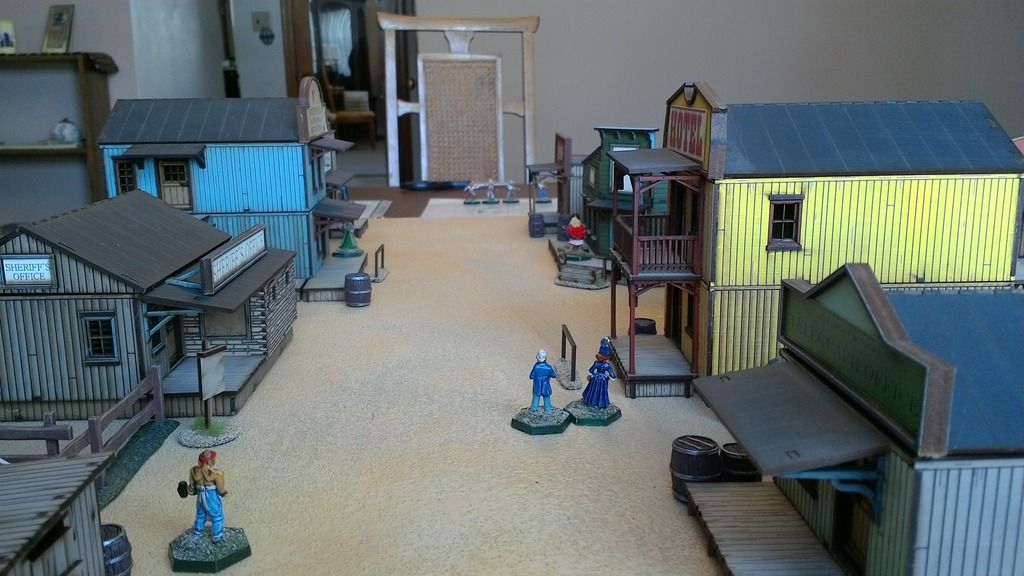 Played another round of western Gun fighting. I have played this scenario before with different players. Interesting enough the ending was simular and just as epic as the last time. In this game I played the Lawmen and won the day. In fact my legendary law man "Nash Bilton" took out 4 outlaws single handedly to win the day  8)
